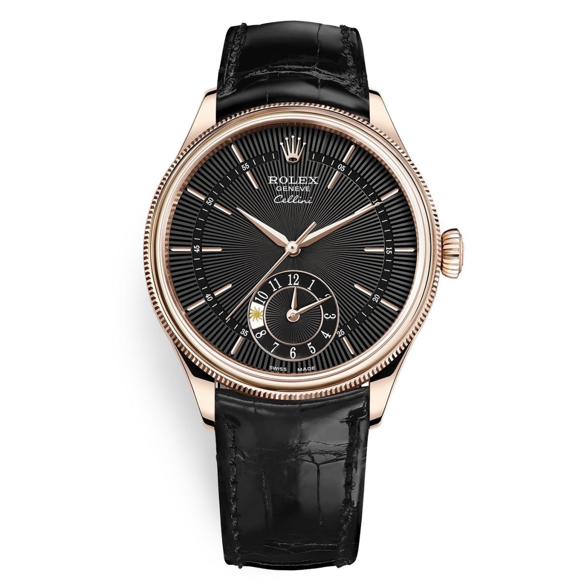 Rolex Cellini 50525 Black Dial Leather Strap Dual Time 39mm Watch Specifications: Case Shape Round Case Dimensions 39mm Case Material 18kt Everose Gold Dial Color Black Crystal Scratch Resistant Sapphire Bezel Fixed Screw-in Crown No Water Resistance 50m/165ft Case Back Solid Band Material…